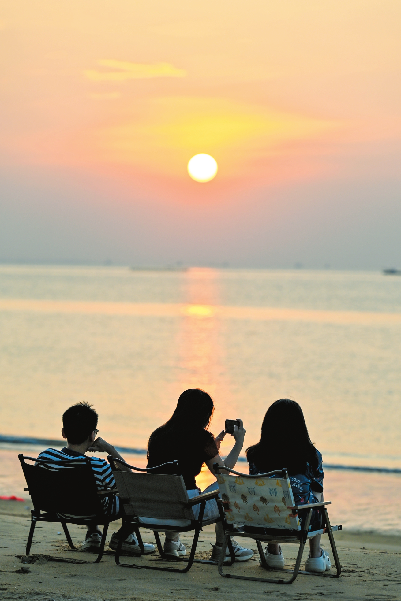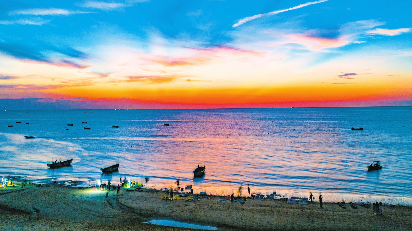 傍晚时分,晚霞映照天际,秀英区荣山寮村沙滩热闹非凡。本报记者 杨忠凯 摄