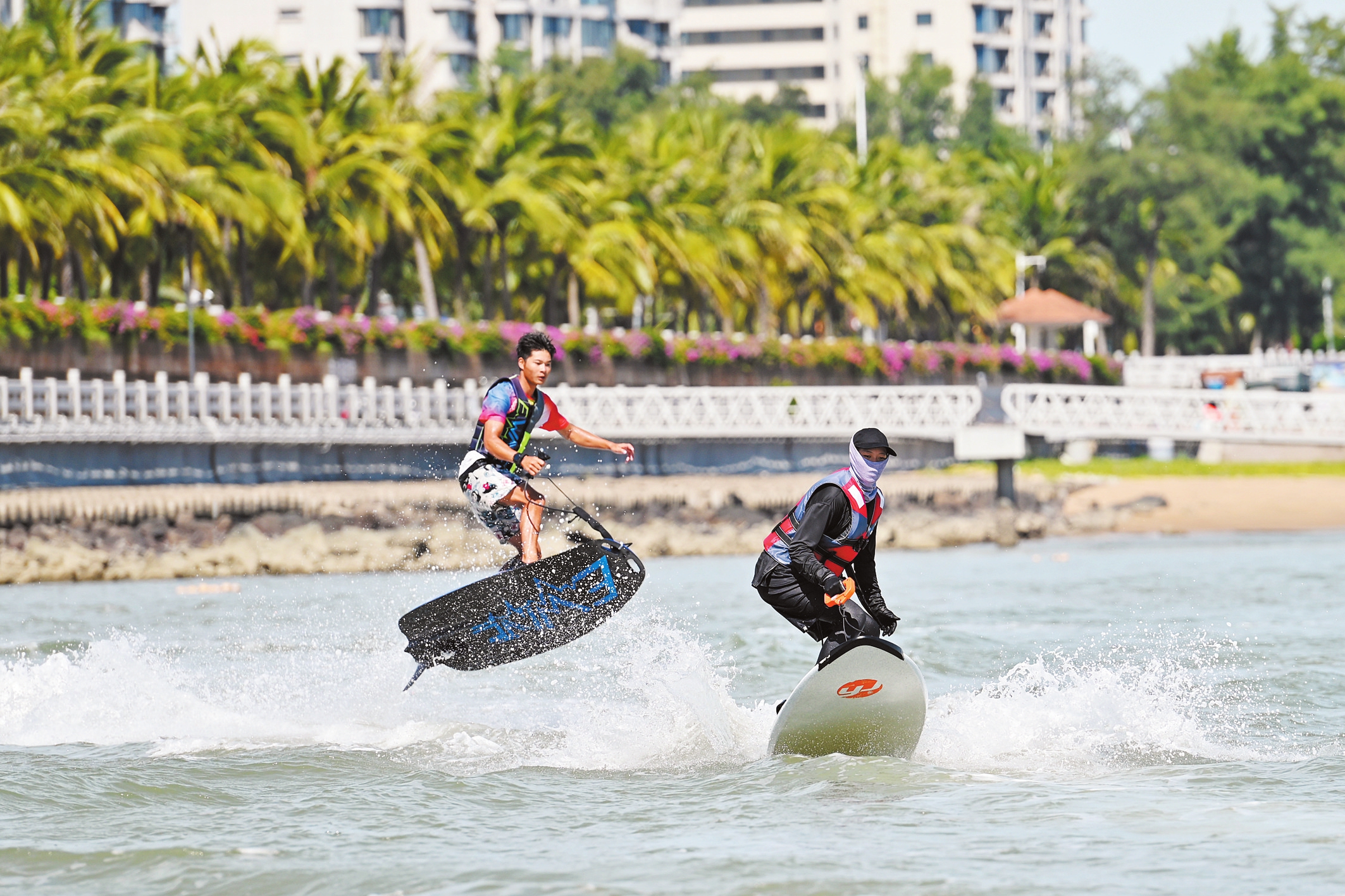 ②2023海口杯帆船赛期间,电动冲浪板表演吸引游客参与体验。本报记者 石中华 摄