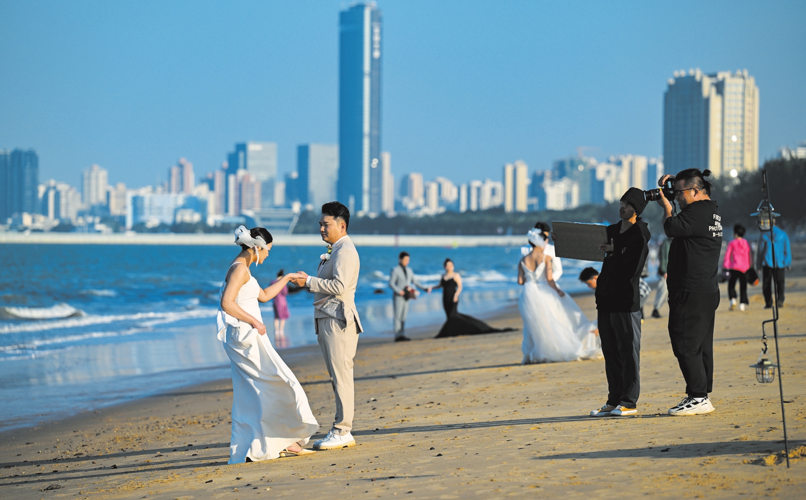 11月20日,天朗气清,多对恋人来到海口西海岸拍摄婚纱照,蔚蓝的海天与金黄的沙滩见证着他们的浪漫幸福。
