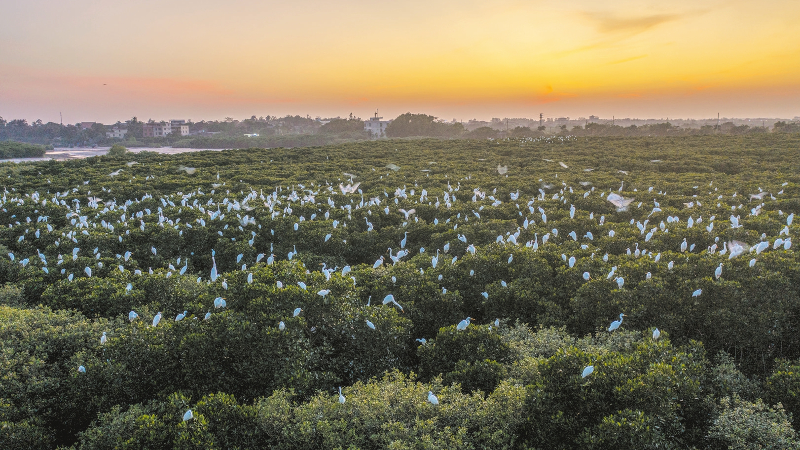 在海南东寨港国家级自然保护区内,白鹭在红树林上栖息。本报记者 康登淋 摄