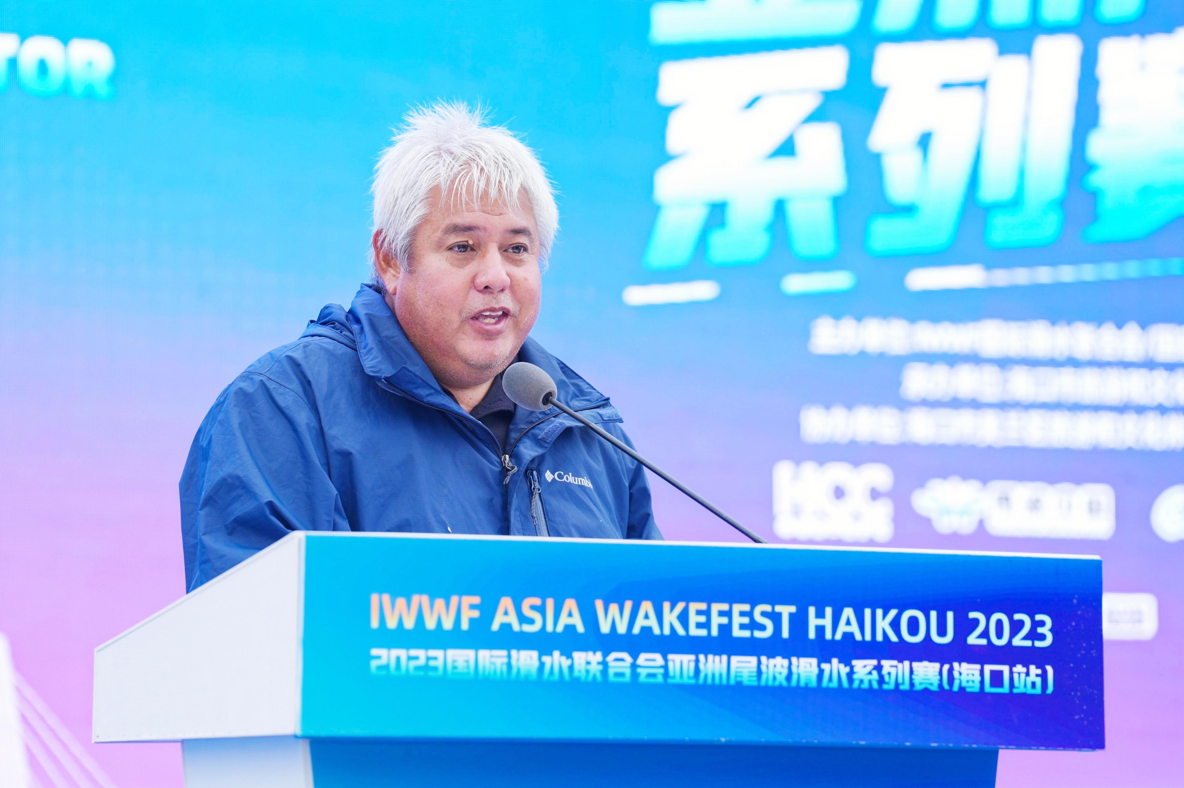 国际滑水联合会执行主任Paul Fong 先生在开幕式致辞,他向海口市旅游文体局对本次比赛的支持表达了衷心的感谢。认为本次赛事将会为滑水运动带来珍贵的留念,并希望未来能有更多的机会在海口举办比赛。