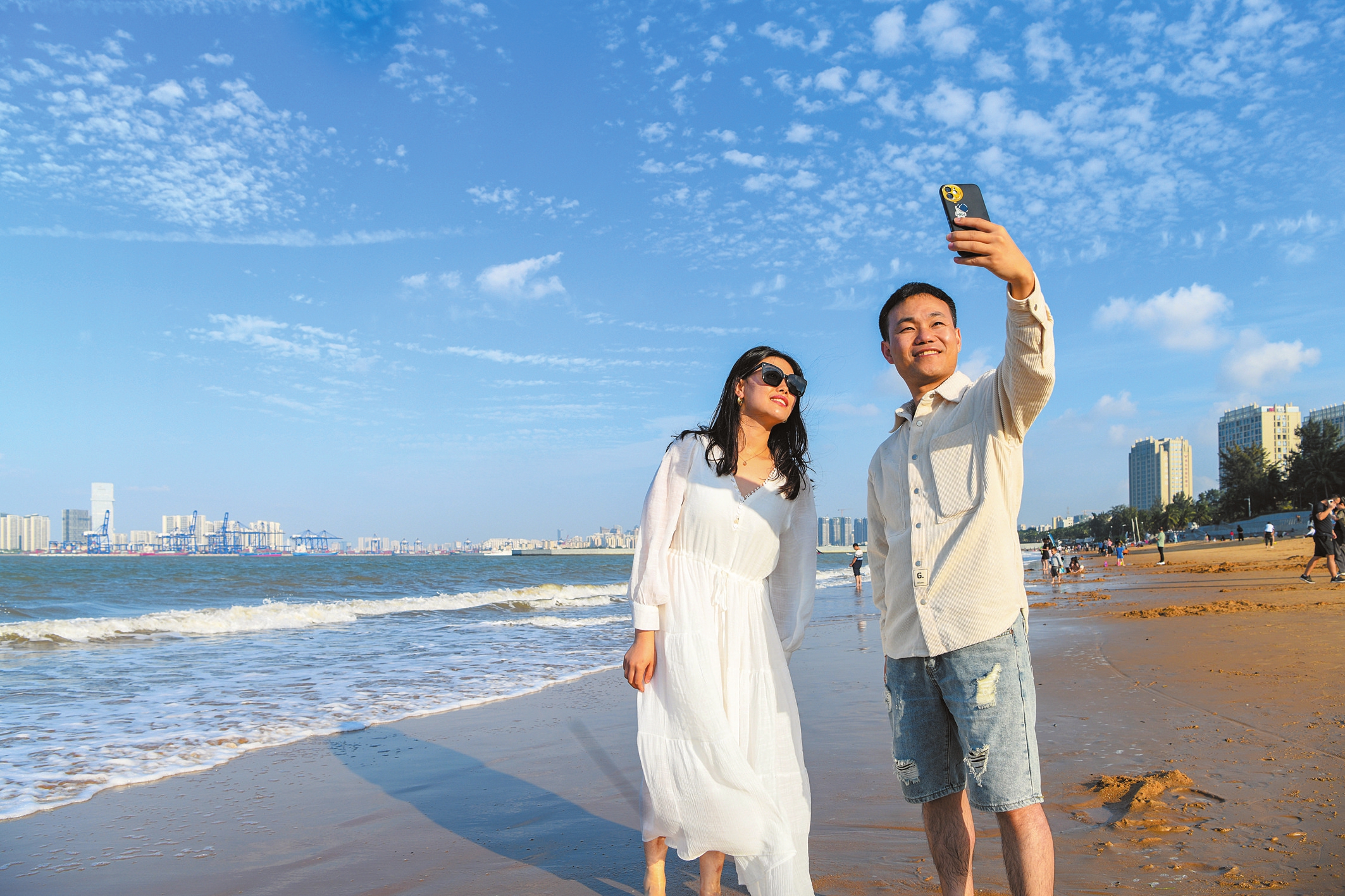 11月26日,在海口西秀海滩,游客在碧海蓝天下拍照留念。 本报记者 苏弼坤 摄