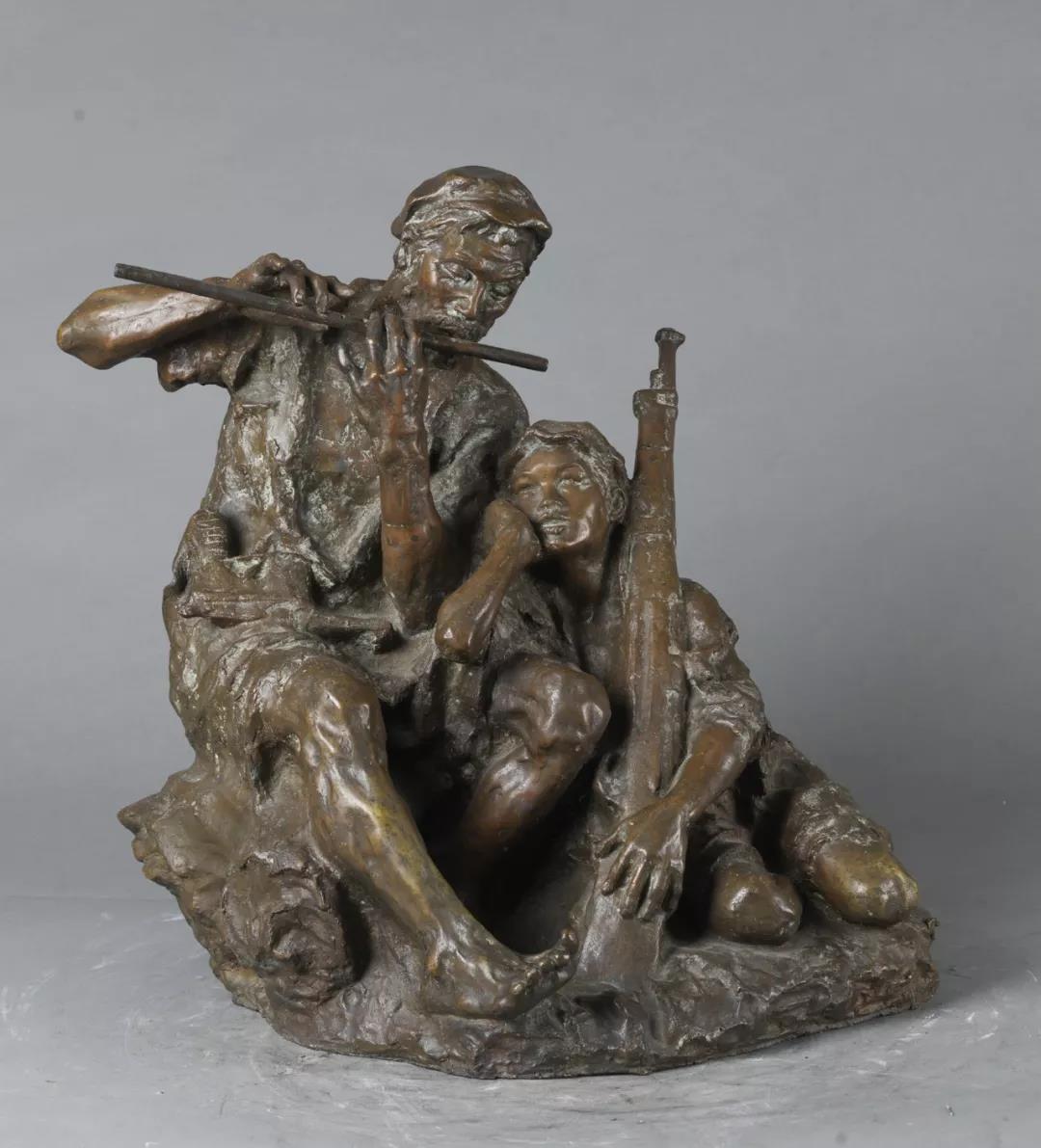 “吹笛子的是一位老红军。他坐在石头上,赤着脚,身上的衣服很破了……一位十来岁的小红军偎依在他的身旁,右手托着下巴,侧着耳朵倾听。……”这篇曾经影响了好几代人的小学课文《在艰苦的岁月里》,也许你已记不清,但是当你再见这件雕塑作品时,肯定已不再陌生。展览中这件我国当代著名雕塑家潘鹤的作品,堪称中国雕塑史上的划时代之作。