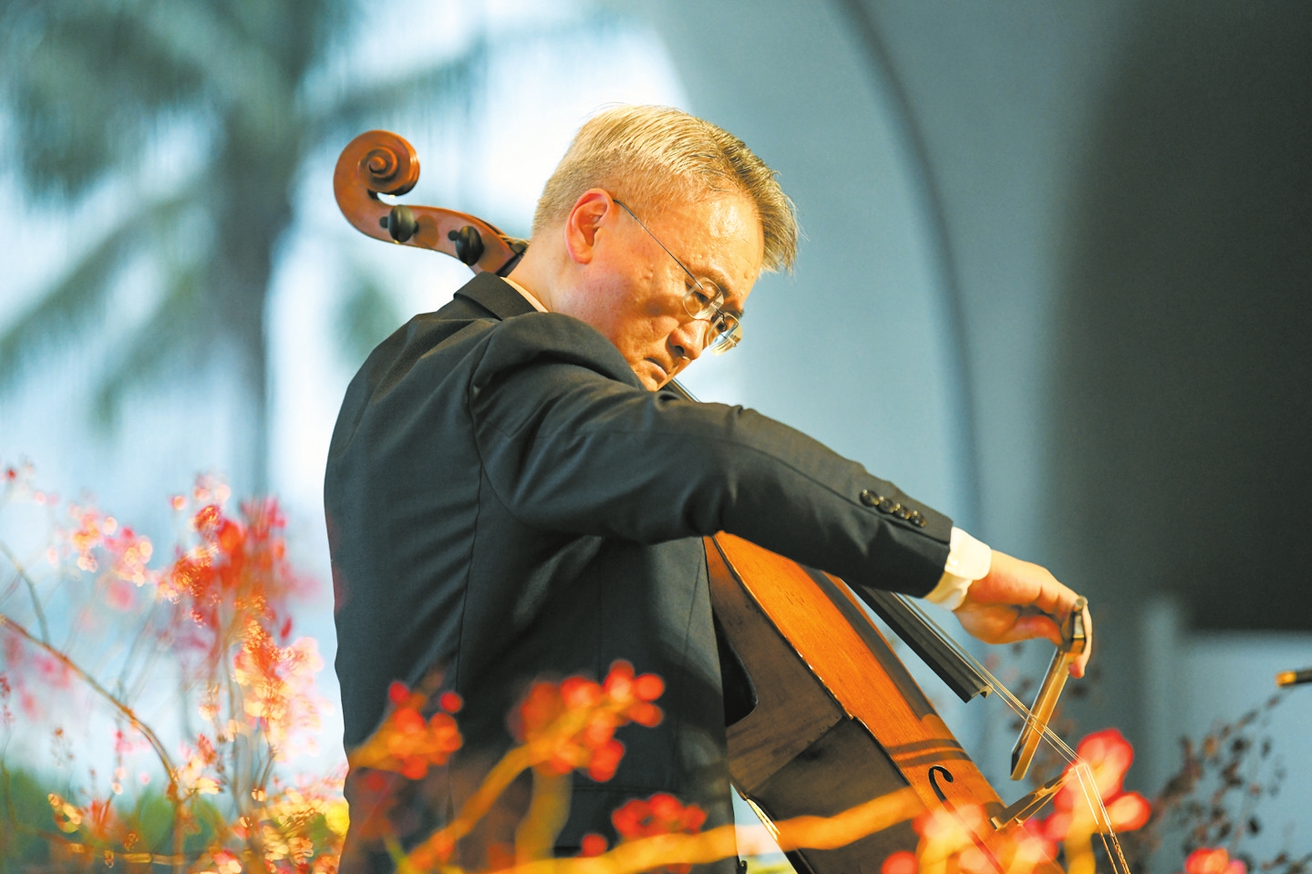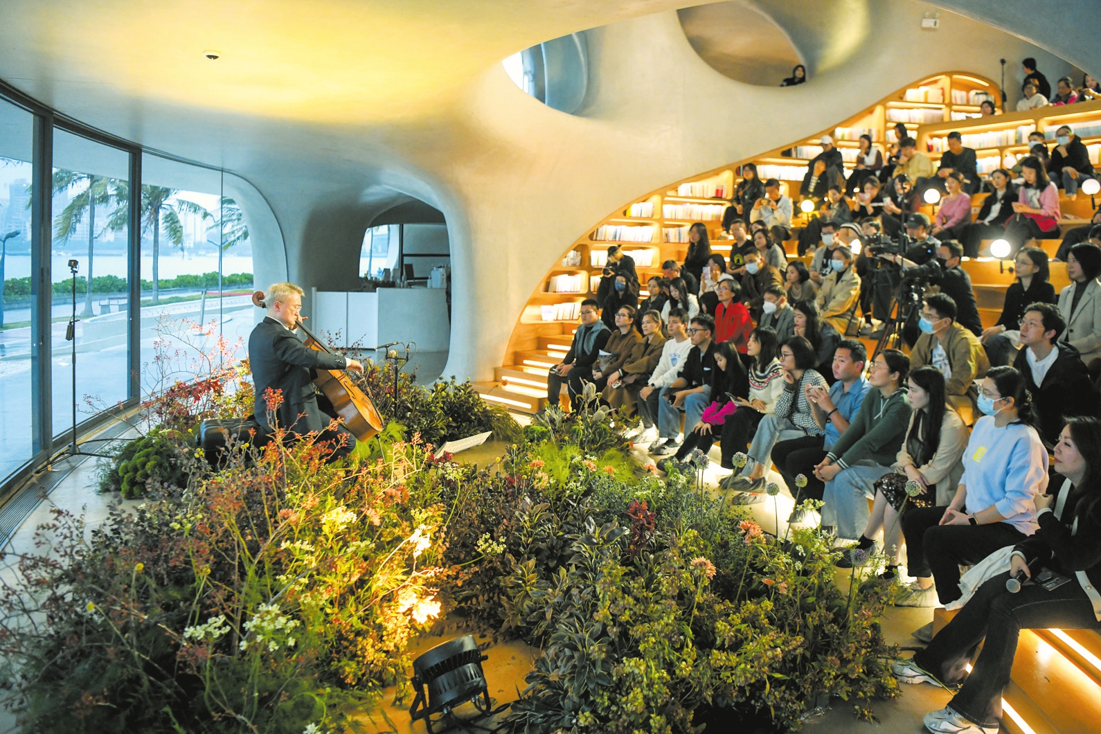 12月17日,在海口云洞图书馆,国际顶尖著名大提琴家王健为椰城观众带来了精彩绝伦的“落日中的巴赫”大提琴独奏音乐会。
