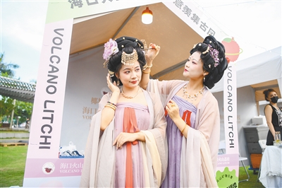 海口云洞图书馆外,两名身着汉服的女子逛市集。海南日报记者 袁琛 摄