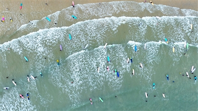 近年来,冲浪这项新潮运动快速兴起,有不少冲浪爱好者长期生活在海南。在三亚皇后湾、万宁日月湾等地,冲浪俨然已经成为一种生活方式。他们有的像吕润金一样,先就地找份工作,然后利用业余时间冲浪;有的是网络作家或自媒体主播,冲浪是他们的创作题材和灵感来源;有的专门到海边租房长住,度过自己的gap year(间隔年),冲浪是他们度假学习的新技能。