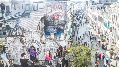 日前,游客在海口骑楼老街拍照打卡。 本报记者 陈元才 摄
