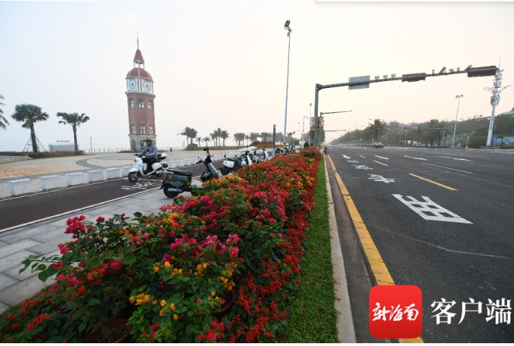 海口西海岸钟楼旁盛开的多彩三角梅。记者 陈卫东摄