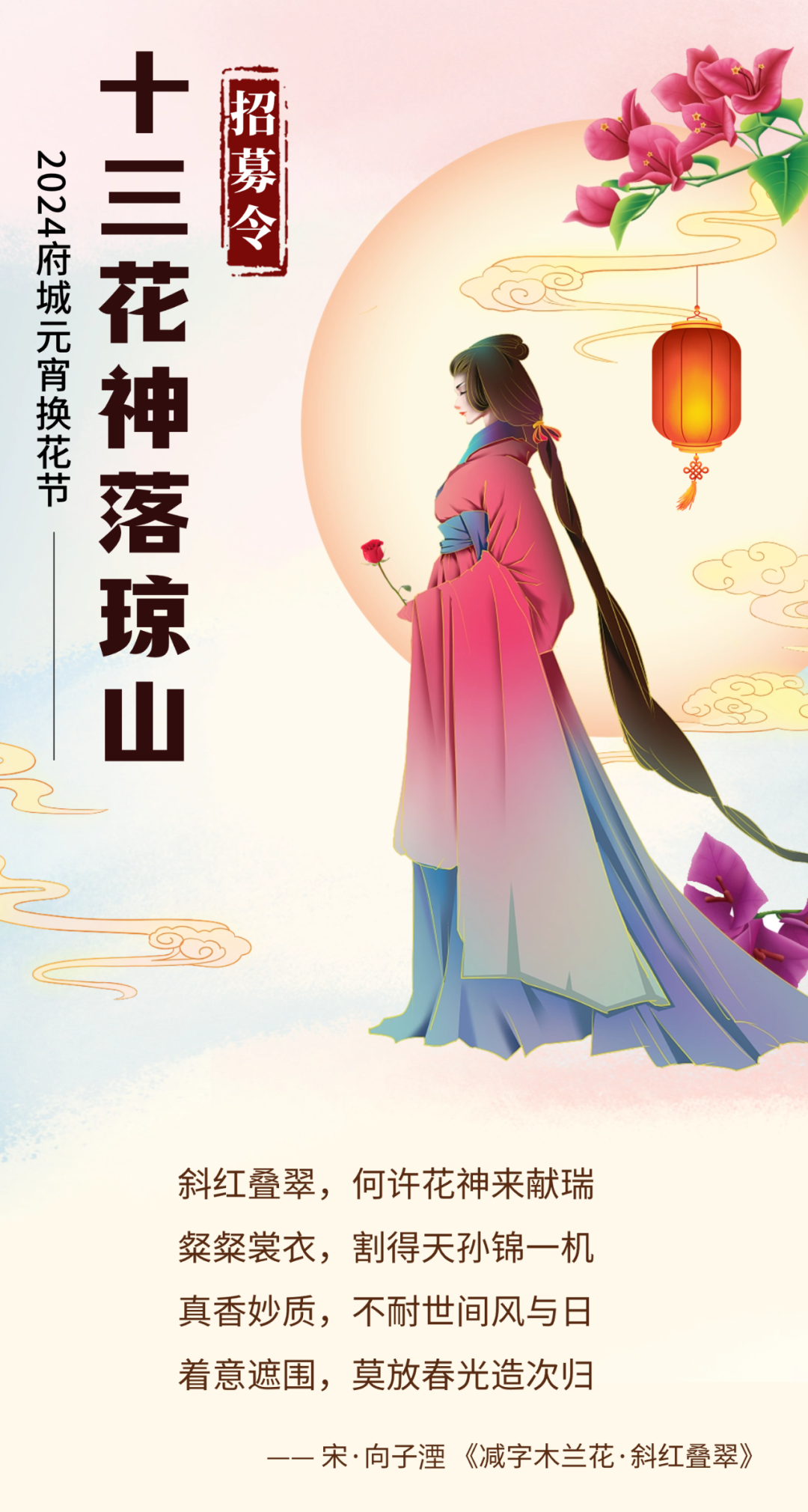 活动将结合十三条古老的琼山街道,以十三种花卉为名,在全国范围内选拔出三位男性“花神”、十位女性“花神”,共计十三位“花神”。获选的“花神”们不仅可以参与2024年府城元宵换花节各项活动,成为元宵换花节的瞩目焦点,还可获得后续推广机会,配合2024年各活动出镜。