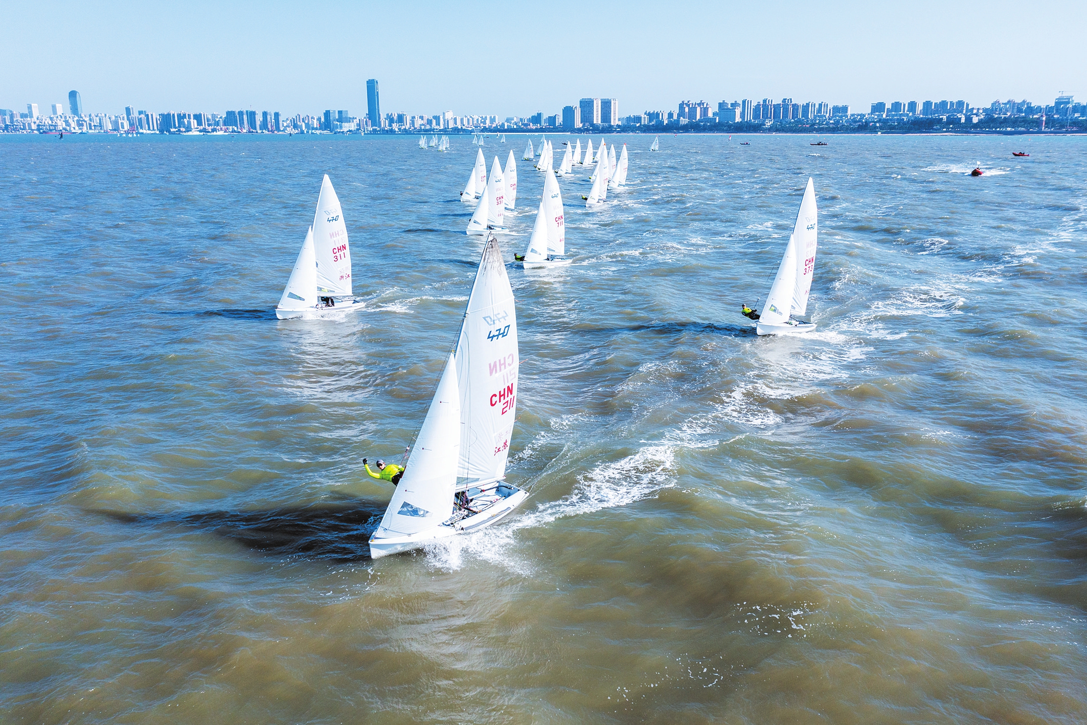 2023年11月17日,全国帆船锦标赛(470级)进行第二个比赛日的争夺。记者 石中华 摄