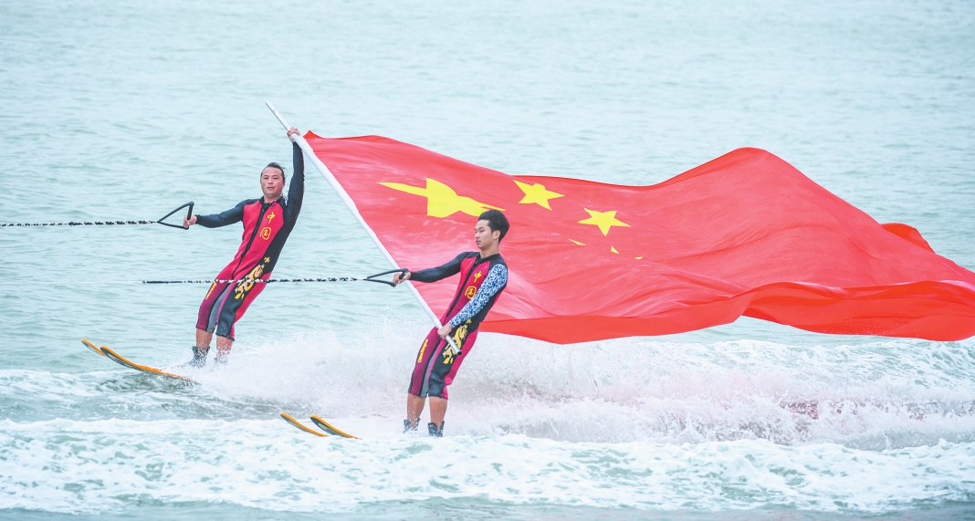 2023年12月2日,国际顶尖滑水表演团队在国际滑水联合会亚洲尾波滑水系列赛(海口站)进行精彩的水上表演。记者 康登淋 摄