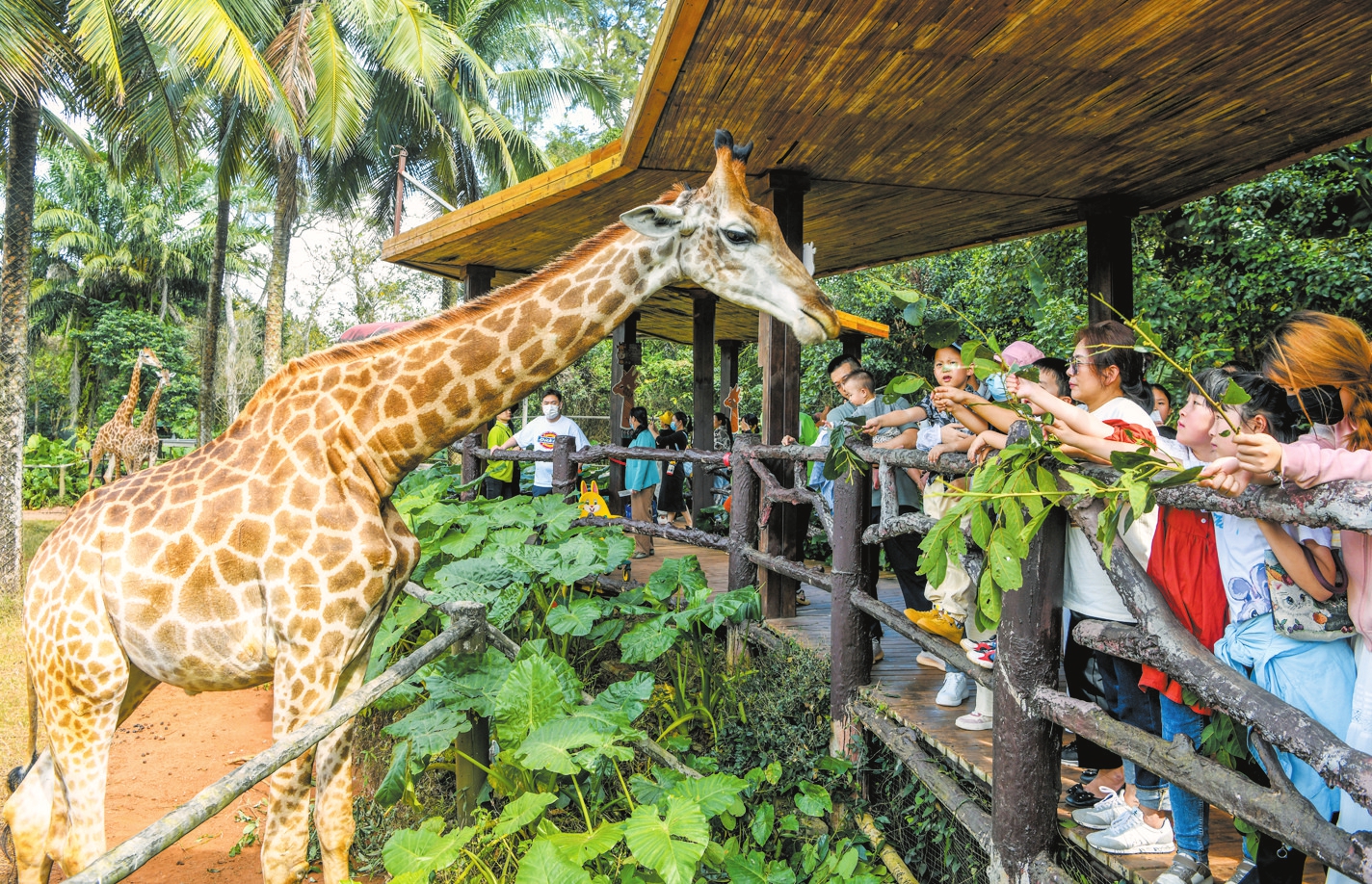 日前,在海南热带野生动植物园内,不少亲子家庭前来游玩,大家与长颈鹿亲密互动,体验与自然亲近的快乐。本报记者 康登淋 摄
