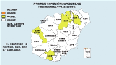 根据我省《关于实行分区分级精准防控、统筹疫情防控与经济社会秩序恢复的指导意见》要求,结合地区疫情实际情况。截至2月29日9时,按县域单元(其中海口市、三亚市以所辖各行政区为单元),我省中风险地区5个,低风险地区21个,经指挥部评估确认,新增三亚市海棠区、崖州区、吉阳区及育才生态区,海口市龙华区、美兰区和儋州市为新冠肺炎疫情低风险地区。