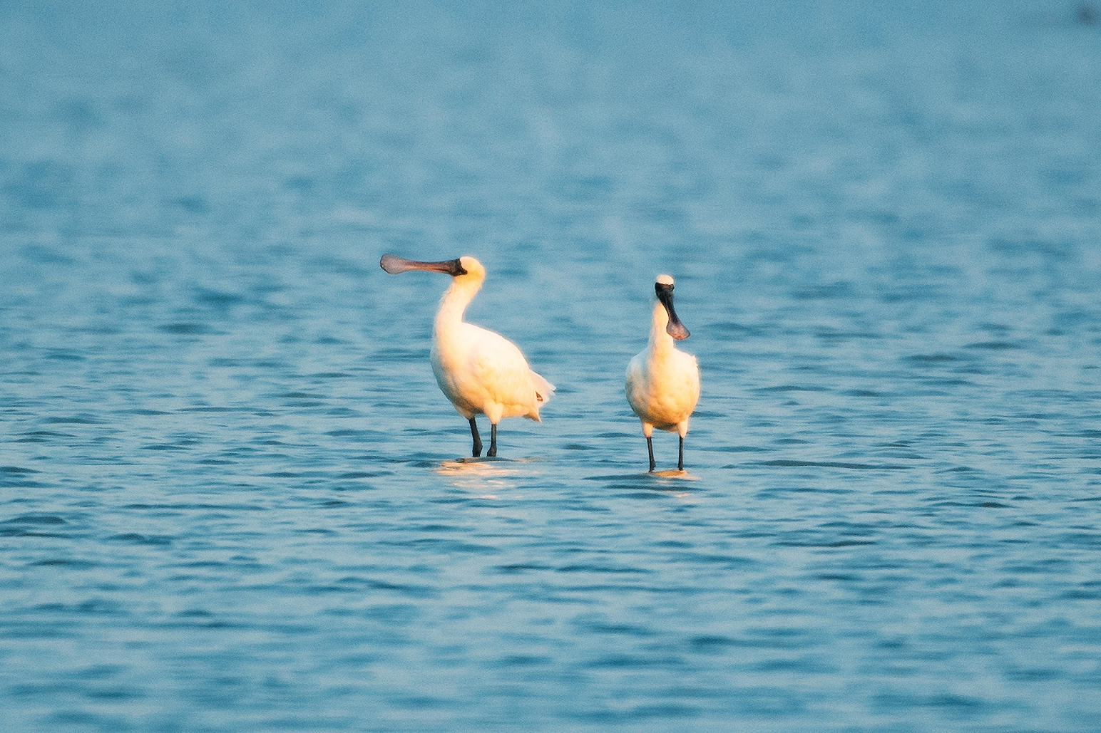 两只“鸟中大熊猫”黑脸琵鹭在海南东寨港国家级自然保护区内觅食。