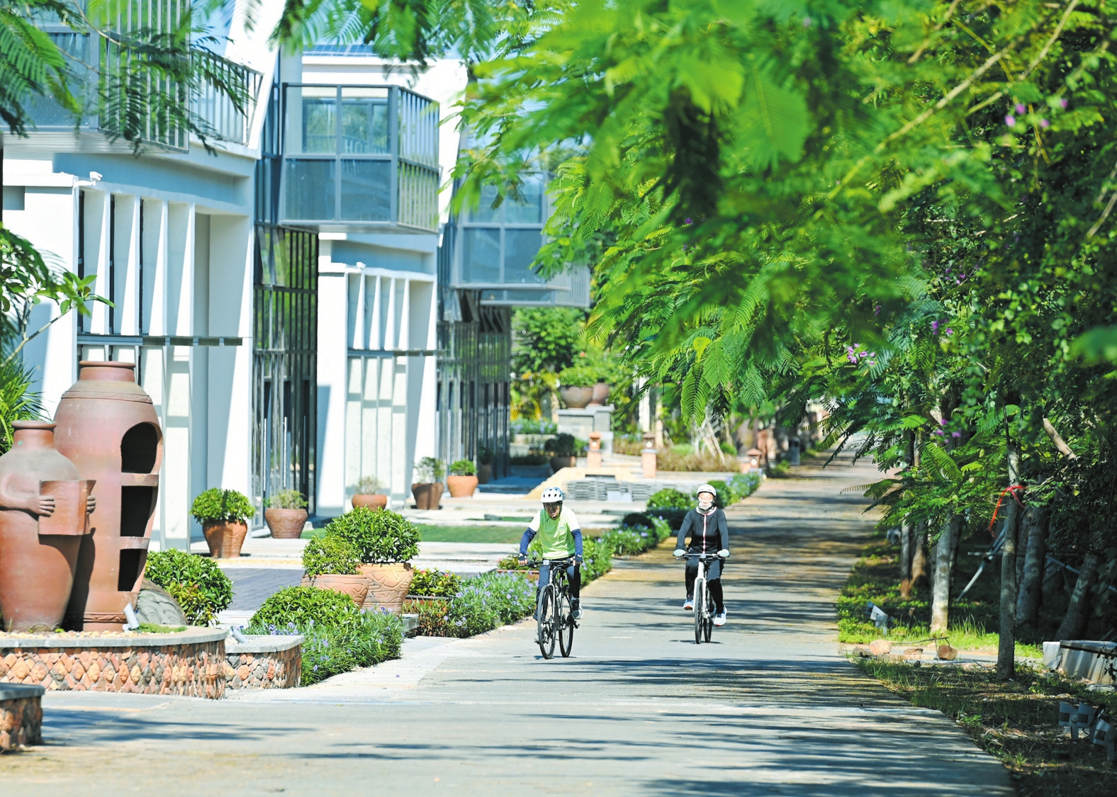 日前,在海口五源河国家湿地公园中,市民游客正在骑行观光。