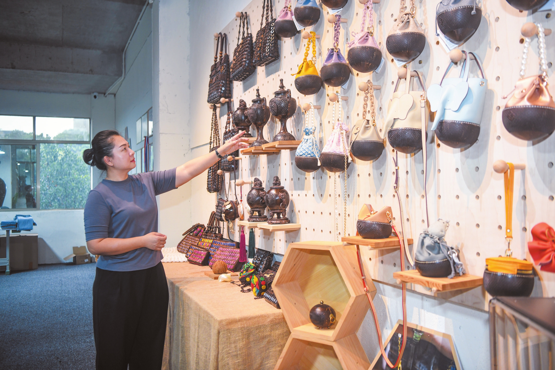 在龙华区龙桥镇龙发村的椰格格(海南)文化科技有限公司,工作人员正在向记者介绍特色椰雕产品。本报记者 杨鹤 摄