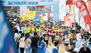 ◀昨天下午,2019海口国际沙滩马拉松赛在假日海滩鸣枪开跑。 本报记者 黄一冰 摄