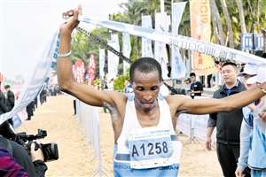 本报11月30日讯(记者甘雁鸿)2019第七届海口国际沙滩马拉松赛今日下午在假日海滩风景区激情开跑,共有来自15个国家的5000余名选手参赛。最终埃塞俄比亚选手罗伯特科获得男子10.5公里冠军,埃塞俄比亚选手阿书玛获得女子10.5公里冠军,我国山东选手徐统帅获得男子10.5公里第三名好成绩。