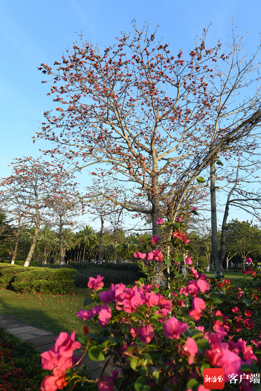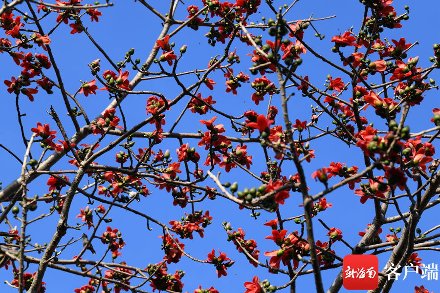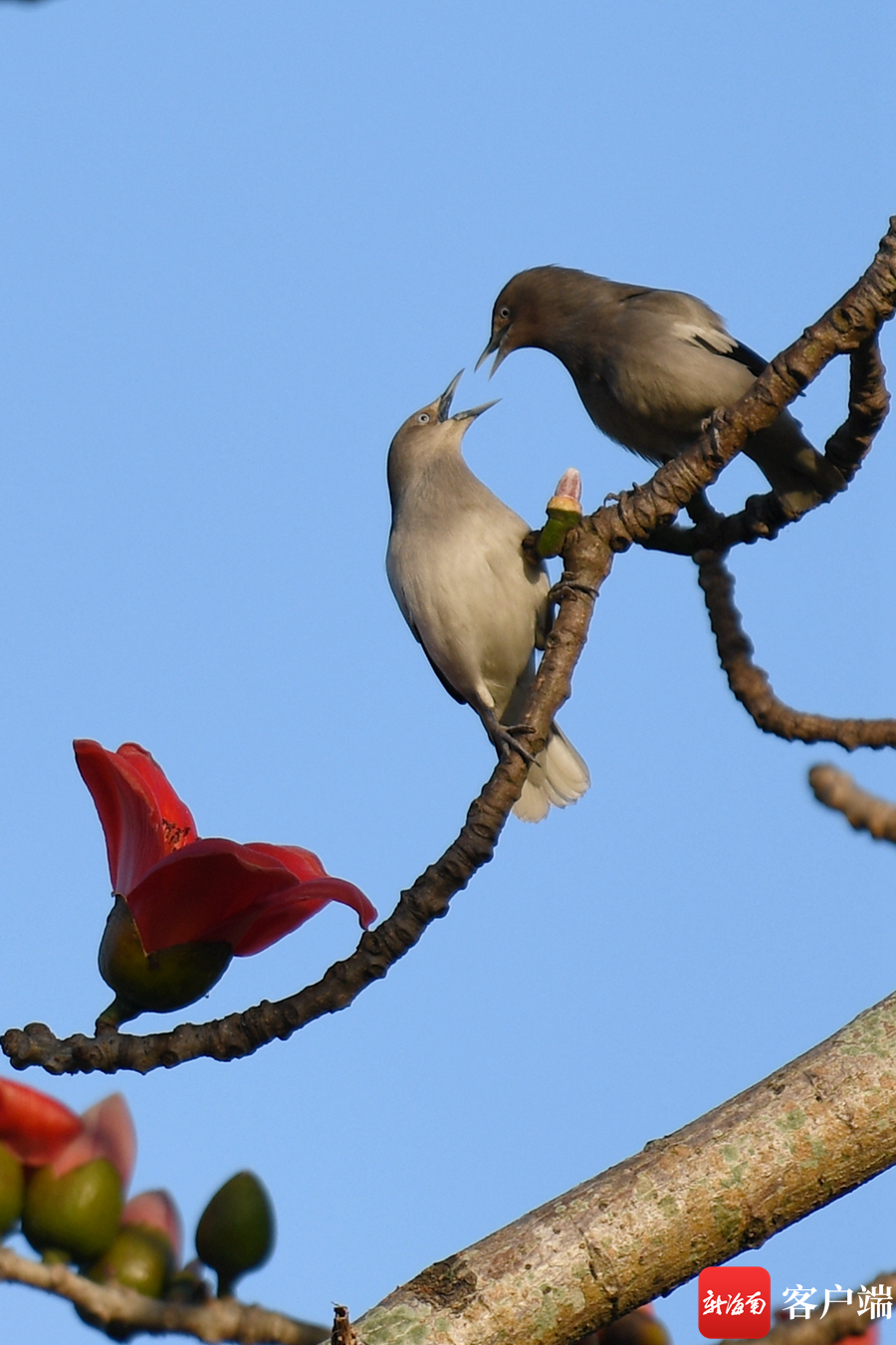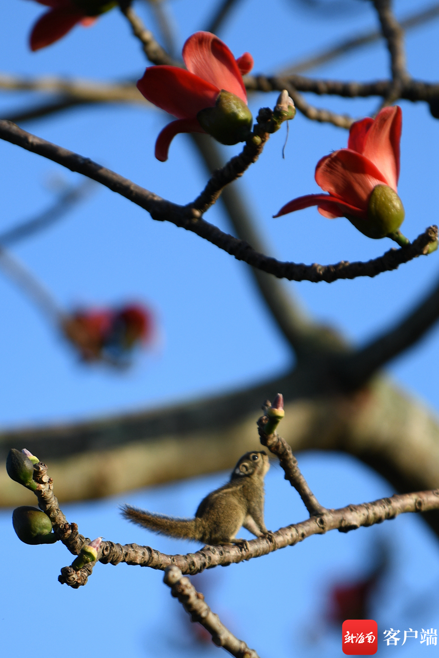 2月18日消息,近日,海口木棉花悄悄开了。18日,记者在万绿园看到,几棵高大的木棉树已经争相开放,鲜艳的木棉花开得如火如荼。小蜜蜂、小松鼠、小鸟都被吸引到枝头上,叽叽喳喳的鸟叫声,仿佛在告诉人们春天已经到来了。