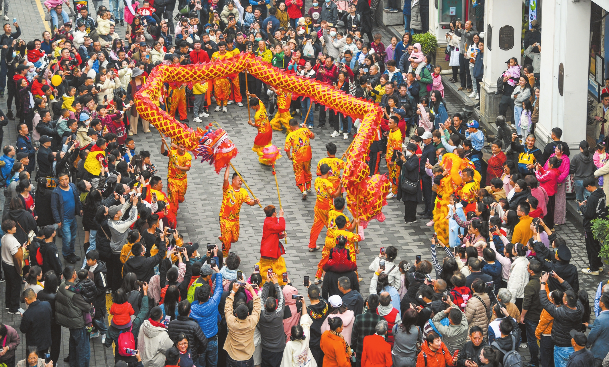 2月10日,海口骑楼老街上演的“龙狮贺春”民俗展演,吸引众多市民游客前来观赏。 本报记者 康登淋 摄