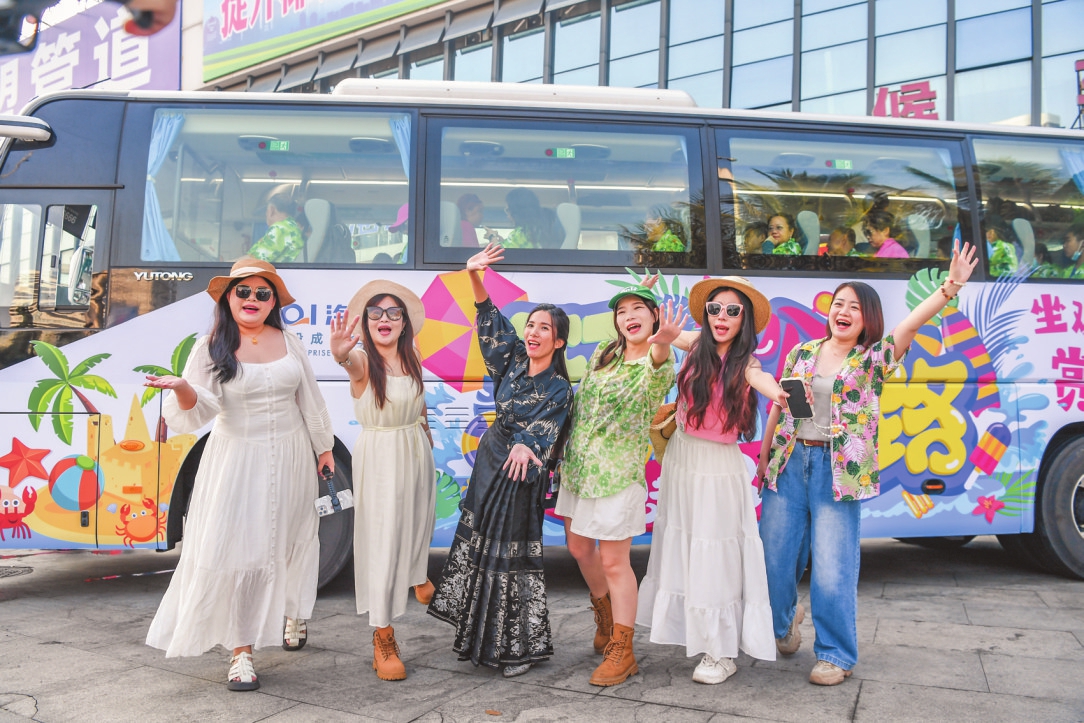 “欢迎大家参加今天的海口至万宁一日游,我们现在为大家发放岛服,再送上一杯咖啡,让我们元气满满地出发!”在开往万宁线路的一辆观光巴士上,导游李超华热情地为大家讲解途经景点、海南发展历史和人文地理,游客们听得津津有味,并不时与导游进行互动,车厢内一片欢声笑语。