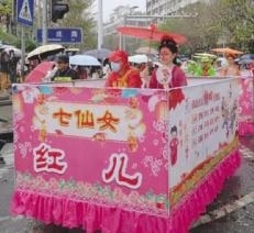 “快看,那是著名清官——海瑞!”当天14时,作为每年府城元宵换花节的重头戏——“装马匹”民俗活动正式开场,由群众扮演的丘濬、海瑞、七仙女等历史名人和传说人物组成“装马匹”队伍给市民游客送元宵祝福。