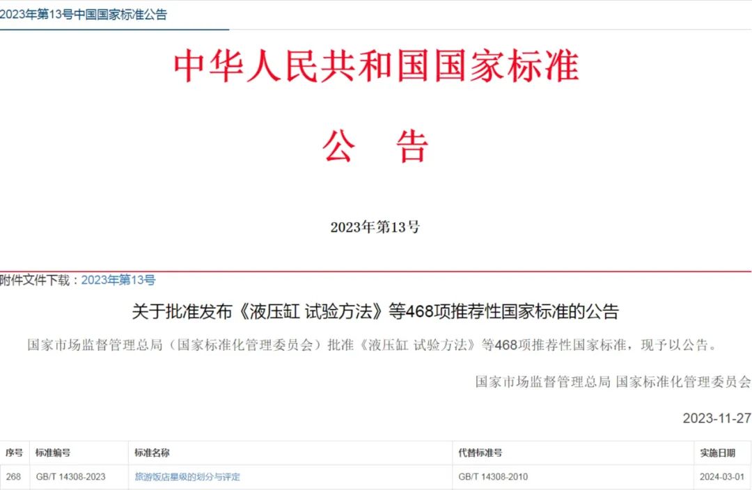 11月27日,国家市场监督管理总局(国家标准化管理委员会)批准发布468项推荐性国家标准,包括由全国旅游标准化技术委员会归口及执行的标准《旅游饭店星级的划分与评定》(GB/T 14308-2023)。此标准为原国家标准GB/T 14308-2010的修订版本。