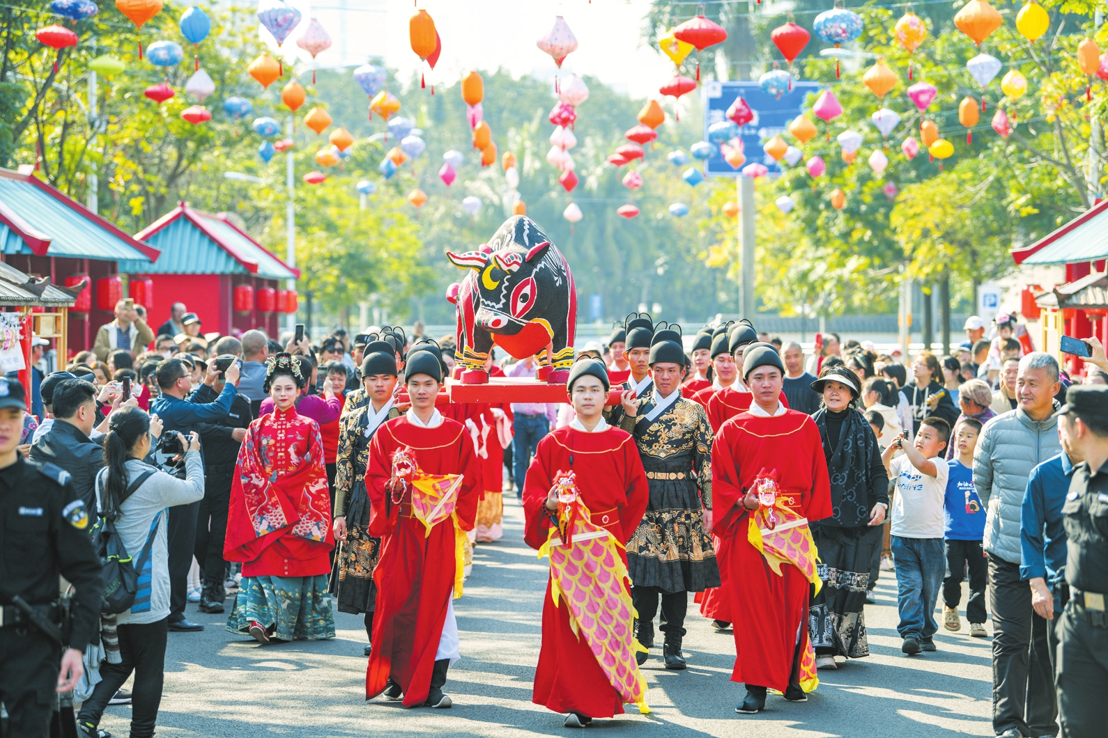 在海瑞文化公园分会场,抬春牛民俗表演为市民游客送上新春祝福。
