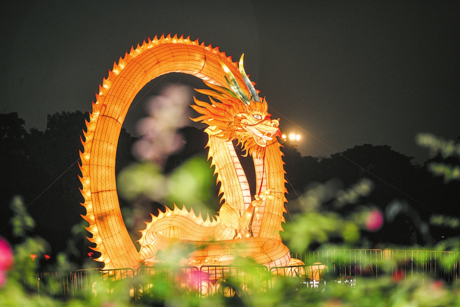 此次灯展共31组,有传统的花灯、宫灯,也有充满现代感的创意灯组,每一盏灯都承载着人们对新年的美好祝愿。每组灯展各具主题,分布在万绿园中央小道的两侧和湖边,包括“锦盒新春”、“福满海口”、“好运连连”、“遥望未来”、“海洋世界”、“科技发展”等各富特色的灯展区令人目不暇接。其中,12米高的“祥龙迎春”吸引了大家的关注,该灯组造型立体,龙身彩色醒目,龙脊轮廓分明,led勾边追光亮眼。