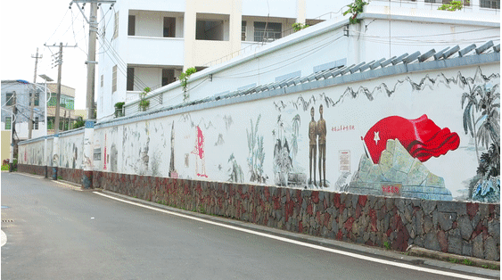 沿着笔挺的沥青路前行,干净整洁的村庄映入眼帘,灰砖白墙的琼北特色民居错落有致。一幅幅壁画栩栩如生,展示着海南人民革命故事,让人仿佛置身于那个波澜壮阔的时代。