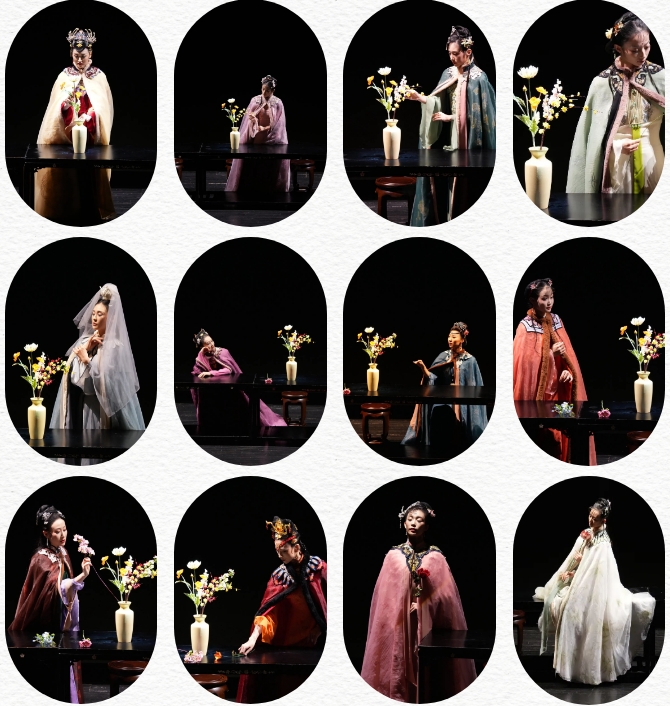 开演前的暖场表演中,十二金钗手持代表自己的花束,伴随声声磬音走至台前,她们或静默伫立,或斜倚长案,优美的体态与手中花束相映成画。在气韵优美的绕梁磬音中,场内的观众也随之安静,目光被演员服饰上的云肩、刺绣、花卉纹饰以及中式审美的舞美帷幔吸引……章回体形式的舞剧段落,上下半场的对襟、各个章节的回扣,经典名场面与创新场面的对照,让整场演出惊喜连连。