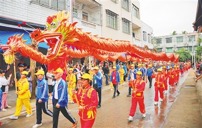 附近村民梁平此次带着孩子一起来参加文化节活动,看着各具特色的巡游队伍,他给孩子当起了“讲解员”,讲述着冼夫人爱国爱民的故事。