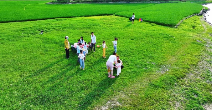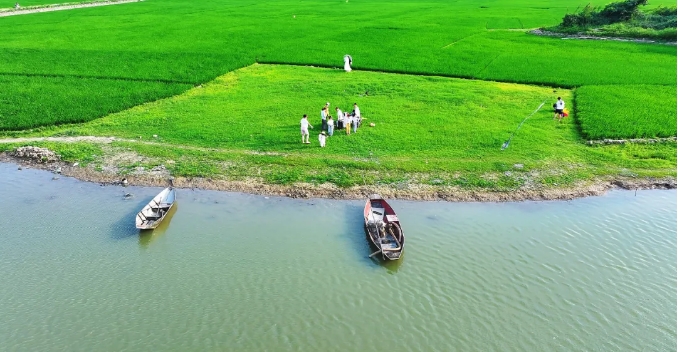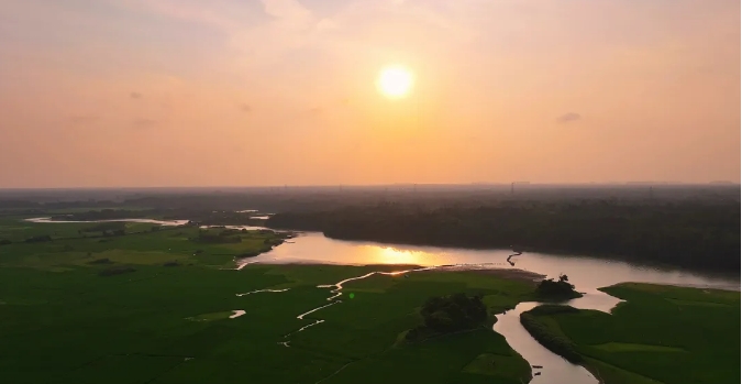 成片绿油油的稻田与蜿蜒的河道交织成景