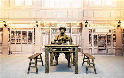 在展厅内,还展示了海口特色名小吃——辣汤饭。此外,展厅融入沙滩造景,体现海口的悠闲假日。