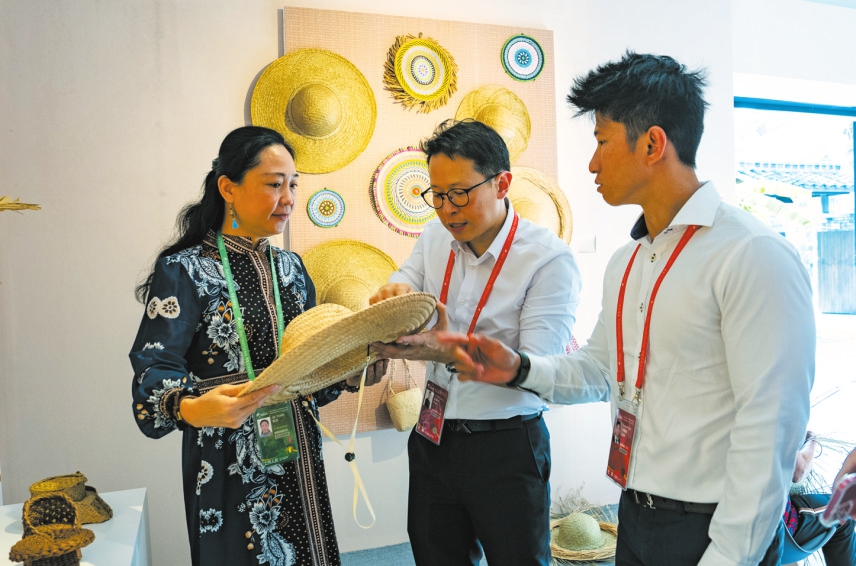 3月27日,在东屿岛文化公园海口城市展东山草编展厅,工作人员给来自新加坡的参会嘉宾介绍东山草编工艺。本报特派记者 杨忠凯 摄