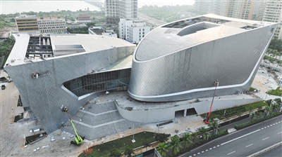 近日,海南省非物质文化遗产展示中心项目室内室外装修完成,工人正进行收尾阶段的外幕墙修补。该项目已进入全面调试阶段,计划下个月进行联合验收。