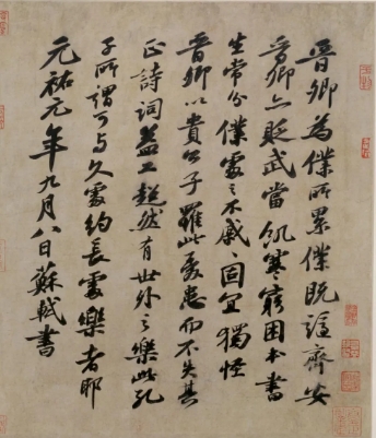 “晋卿为仆所累,仆既谪齐安,晋卿亦贬武当。饥寒穷困,本书生常分,仆处之不戚戚。固宜。独怪晋卿以贵公子罹此忧患而不失其正,诗词益工,超然有世外之乐。此孔子所谓可与久处约,长处乐者耶。元祐元年九月八日苏轼书。”