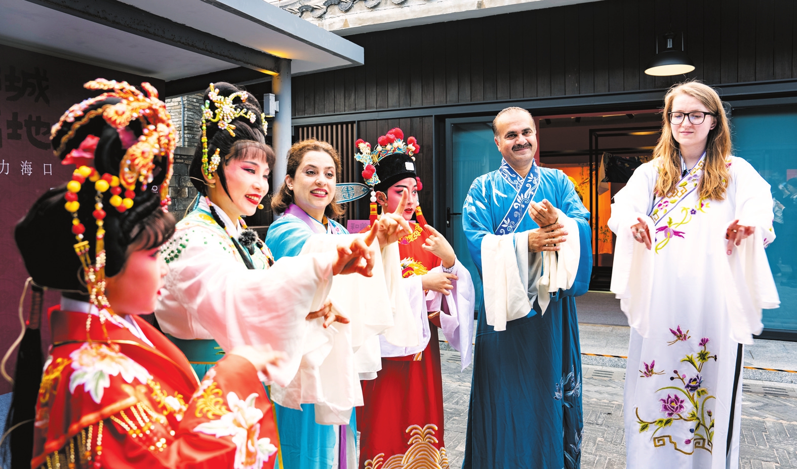 3月28日,在东屿岛文化公园海口城市展“和韵”展厅内,三名外籍记者正在体验琼剧表演,并跟随海南省琼剧三团的演员们完成一些简单的琼剧动作。本报特派记者 杨忠凯 摄
