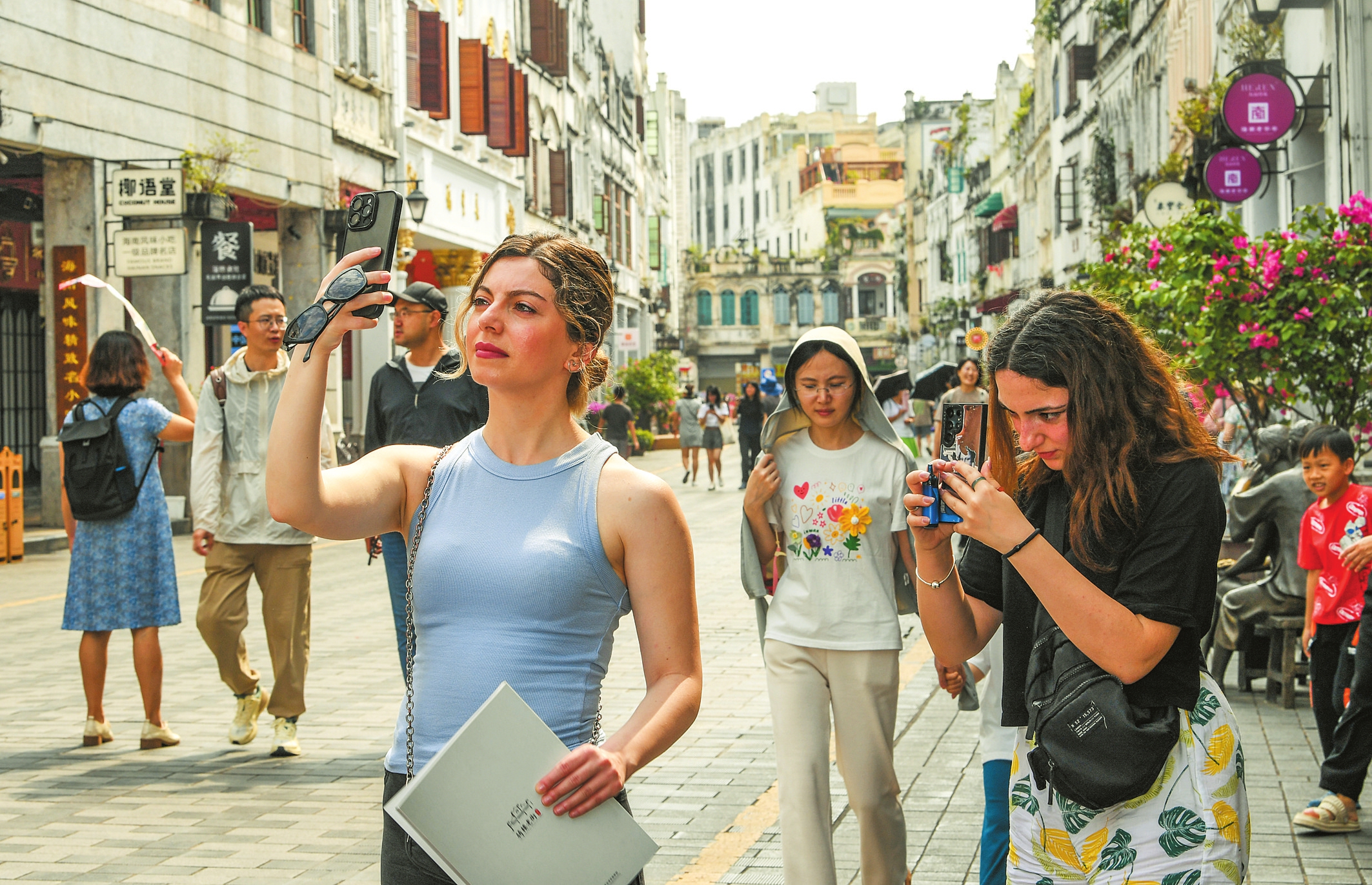“这里的建筑非常有特色,融合了亚洲和欧洲风格,为城市增添了独特的魅力,我很喜欢。”格鲁吉亚伊梅季电视台(Imedi TV)记者Nini Chubinidze边走边拍,这是她第一次来中国,也是第一次来海口,对骑楼老街的一切都感到新鲜,“老街很有味道,人们很友好,美食也很丰富。”