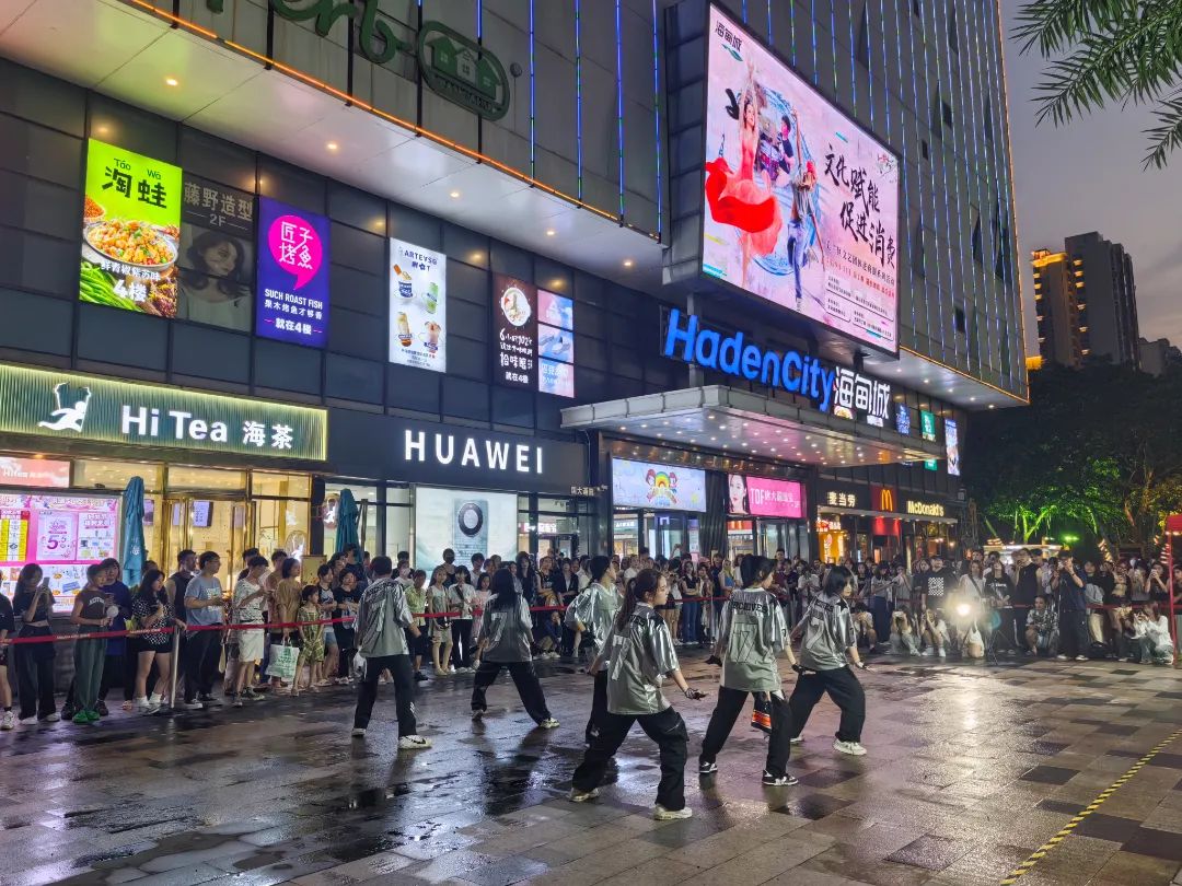 与此同时,海甸城北广场被光彩夺目的灯光粉饰得更为迷人,在轻柔的晚风中,一场开放式的随机舞蹈正在激情上演。随着音乐的不停切换,现场氛围感直接拉满,青春活力在海甸城肆意蔓延,搅动着原本宁静的夜晚,舞蹈热潮将凉风也变得温热。面对商圈人气火爆势头,商户紧抓热度将高涨的人气转化为消费力,商场里各类优惠促销活动随处可见,吸引大批市民游客前来光顾。此外,为期3天的桫椤湾春日小集也通过风味美食、文创产品、非遗手作等品类丰富的活动内容,有效营造街区“夜经济”消费氛围,掀起新一波消费热潮。