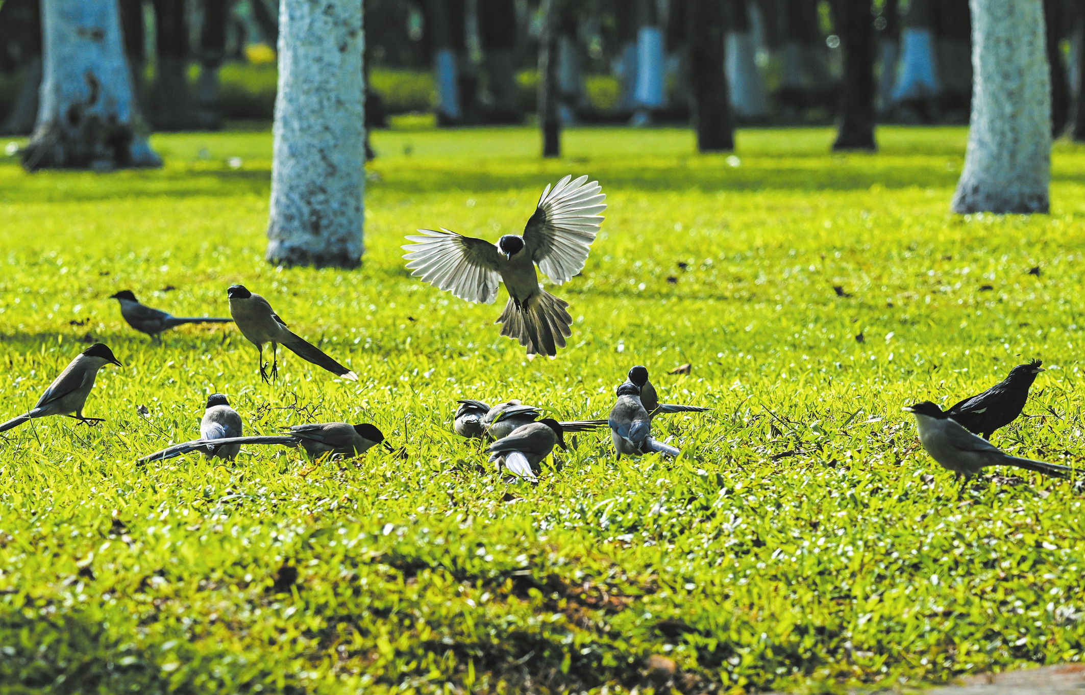 在海口万绿园,八哥、灰喜鹊正在悠闲地觅食、嬉戏。