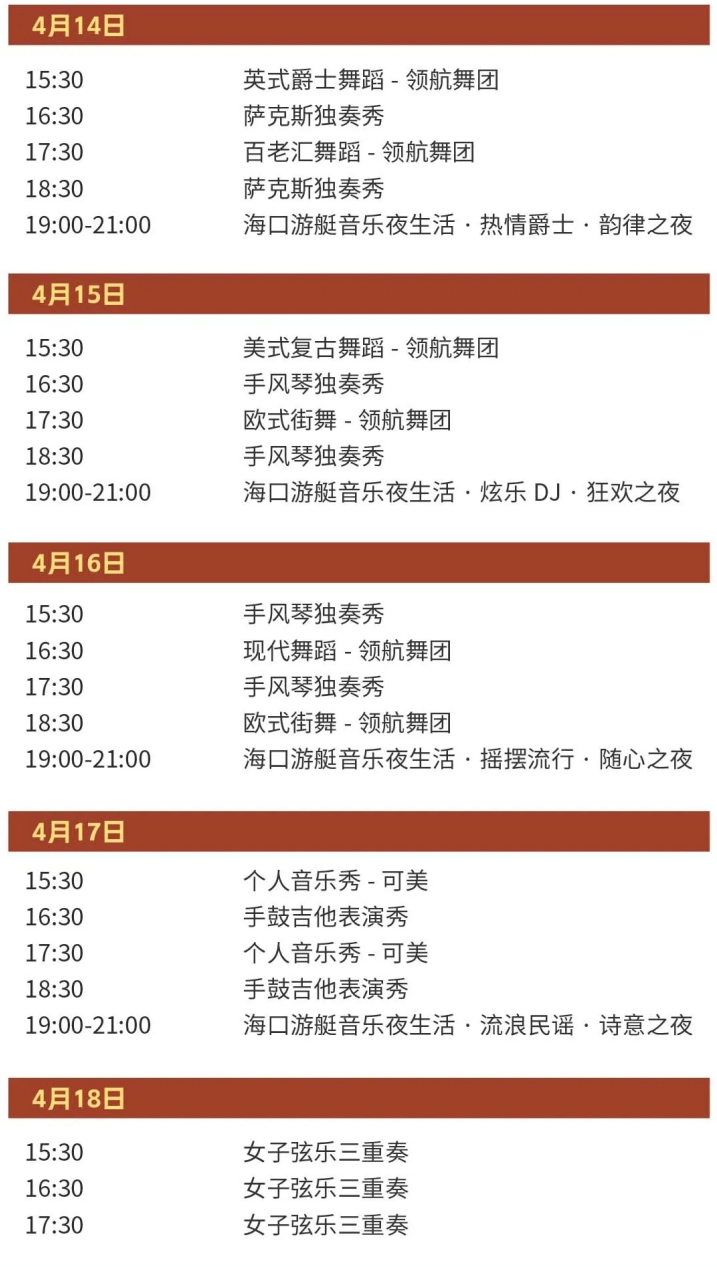 同时,“海口游艇音乐夜生活”打造了4个主题之夜,分别为:“热情爵士·韵律之夜”、“炫乐DJ· 狂欢之夜”、“摇摆流行·随心之夜”、“流浪民谣·诗意之夜”,在活动区中还将设置美食与饮品展位,带你感受不一样的夜间文娱生活。