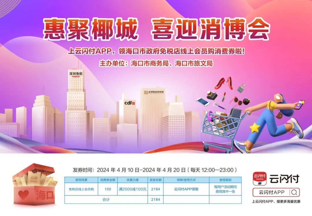 领券时间:4月10日至20日每天12:00-23:00(本轮消费券将通过云闪付APP发放面值为满2000元减100)