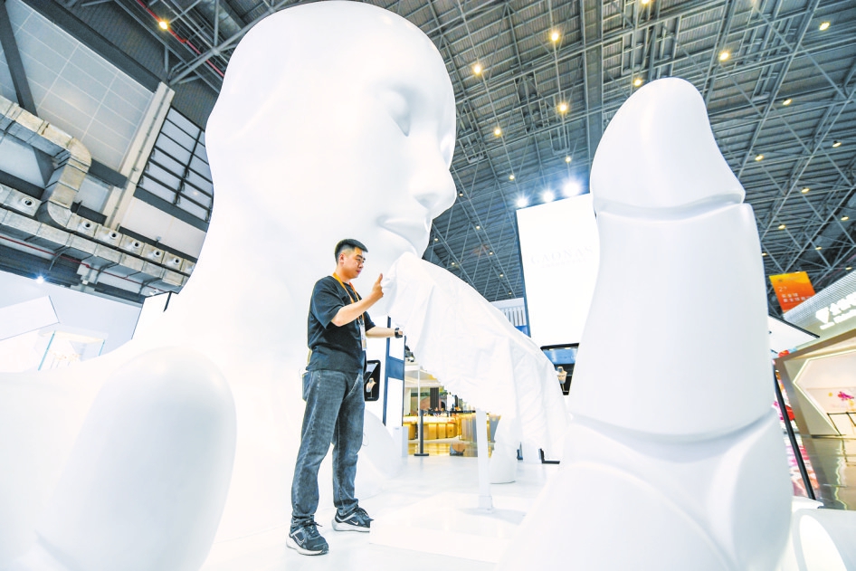 工作人员在设计展台造型。本报记者 康登淋 摄