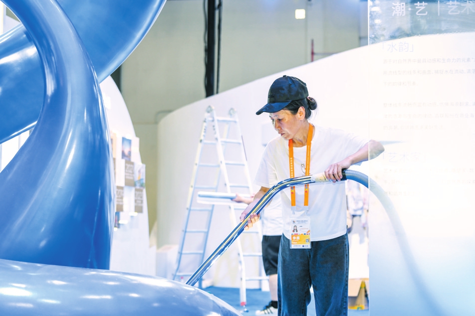 工作人员在清洁搭建好的展台。本报记者 康登淋 摄