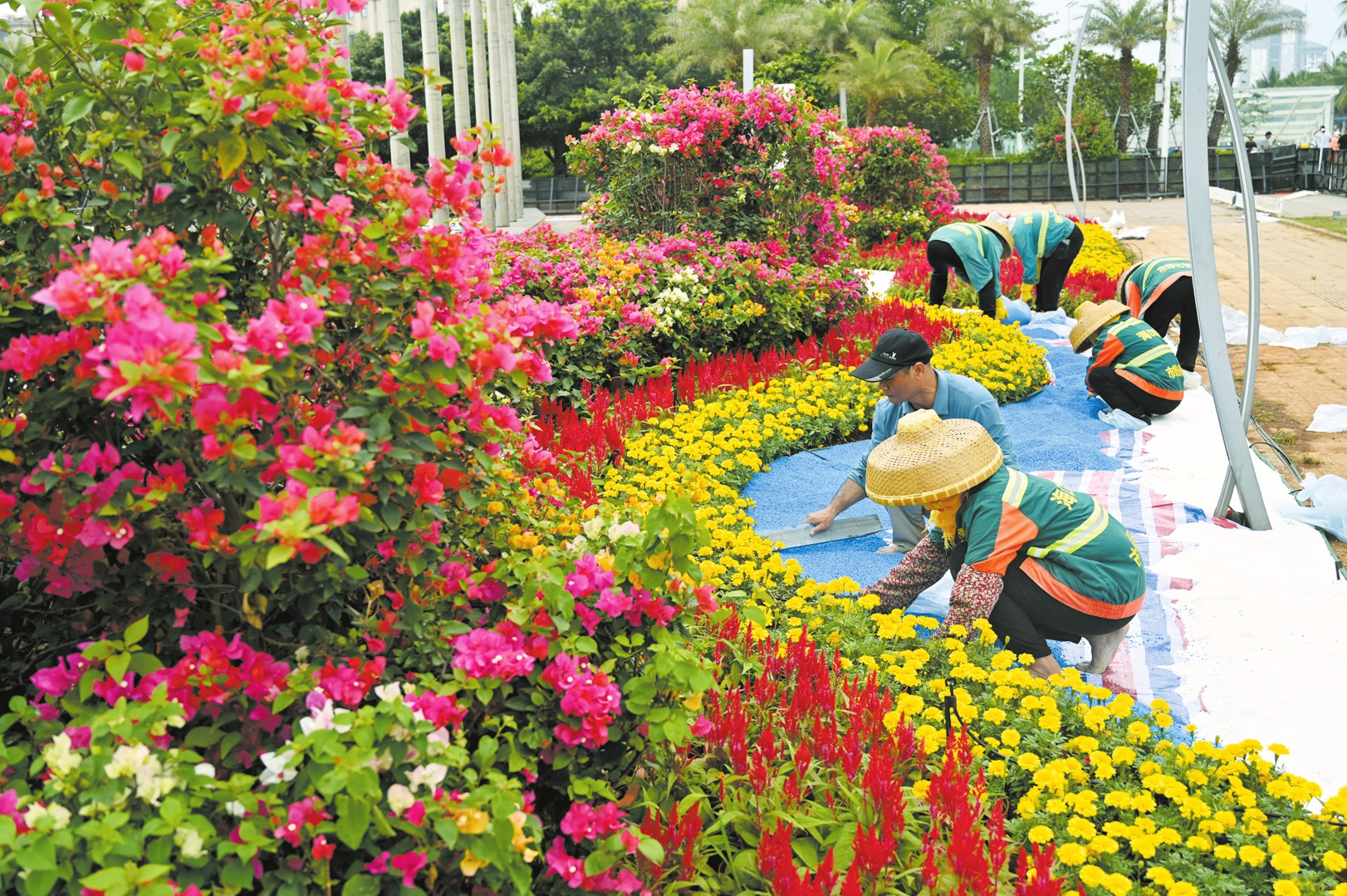 海南国际会展中心前的广场上,园林工人在铺设花圃,美化环境,迎接消博会。本报记者 石中华 摄