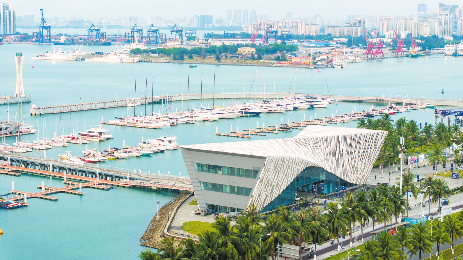 在海口市国家帆船基地公共码头,本届消博会游艇展暨2024中国(海口)国际帆船游艇展布展工作正在有条不紊地开展。本报记者 杨鹤 摄