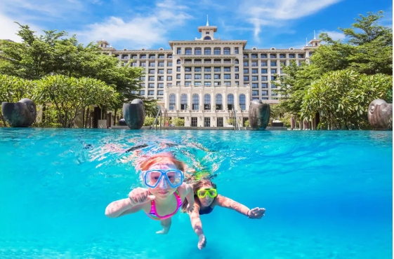酒店位于新埠岛南渡江入海口,与绚丽江景海景融为一体。漫步至江畔泳池温泉,椰林环绕,还可以在独立温泉池泡一泡,沉浸式感官体验中放松自我。