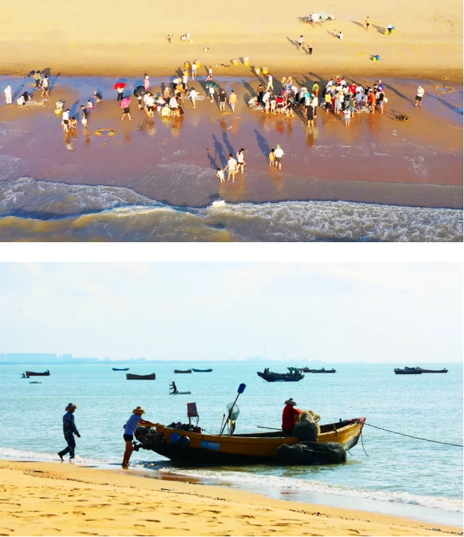 渔船在海浪的轻拍下摇晃舞动,远处仍在行驶的船只,则在两侧绘出一道道洁白美丽的浪花。此情此景,宁静又恬淡,让人身心轻快。喜欢赶海的朋友,也可以在这里体验收获的喜悦哦!