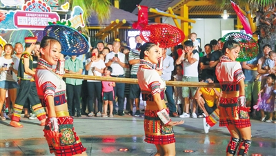 旅游综合体渐成海南旅游“新引力”。图为三亚海昌梦幻海洋不夜城内,演员在表演竹竿舞。 通讯员 王媛媛 摄